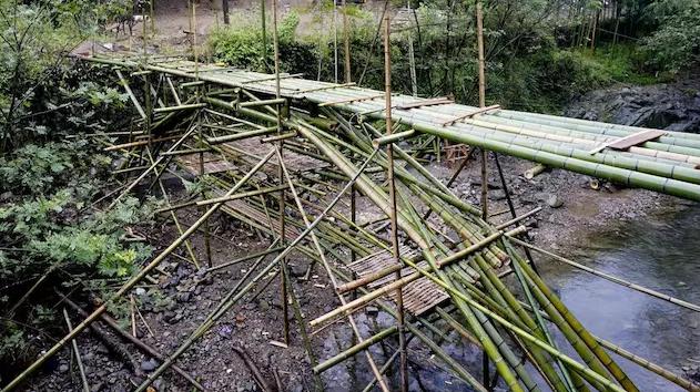 第二個(gè)階段的施工期間一共有 23 天。這段時(shí)間里,設(shè)計(jì)師每天都和工匠在一起,從橋的基礎(chǔ)到結(jié)構(gòu)、圍欄、橋面,控制施工細(xì)節(jié)。竹子經(jīng)過簡(jiǎn)單的加工,就開始了它的成橋之旅。