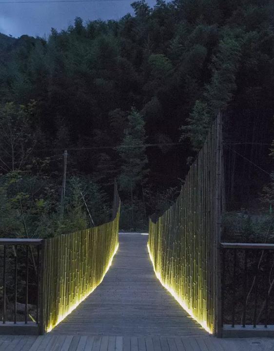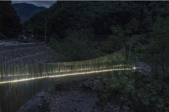 最終,在余姚中村小溪上架起的這座竹橋,僅花了 2.6 萬,其中 2.1 萬人工費(fèi),5000 元材料費(fèi)。它造價(jià)低廉卻質(zhì)樸優(yōu)美,僅有 1.2 米的橋身剛好是足夠一人走、另一個(gè)人側(cè)身而過的尺度,到了晚上,小橋上安裝的燈帶散發(fā)著微光,為它增添了一分別樣的美感。